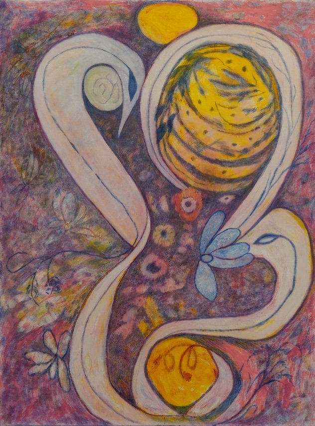 Two winged hearts under two moons, 2023, oil on canvas, 24 x 20 inches.